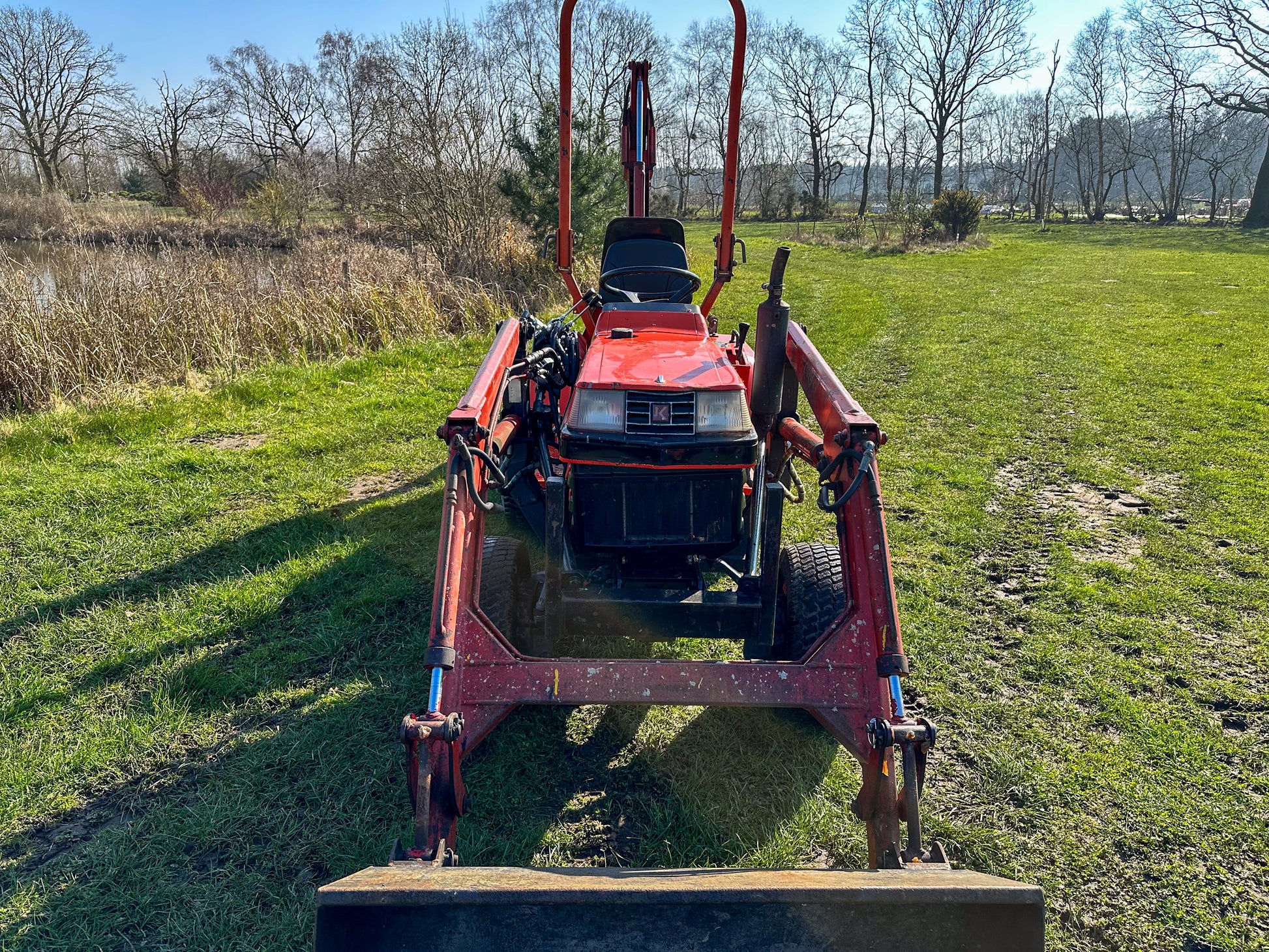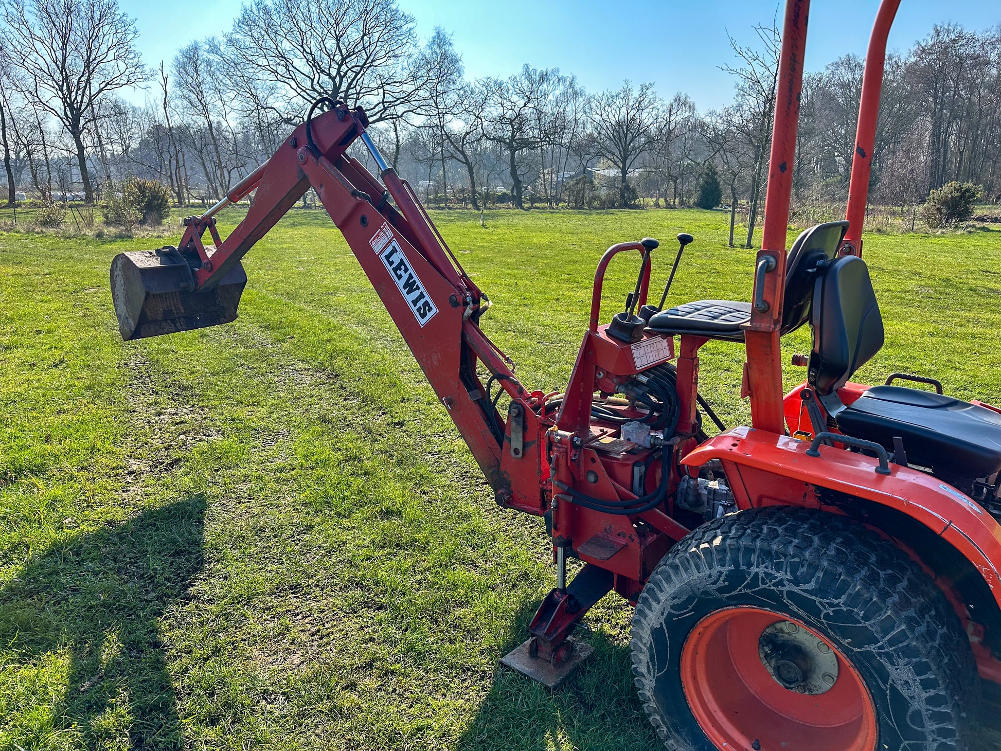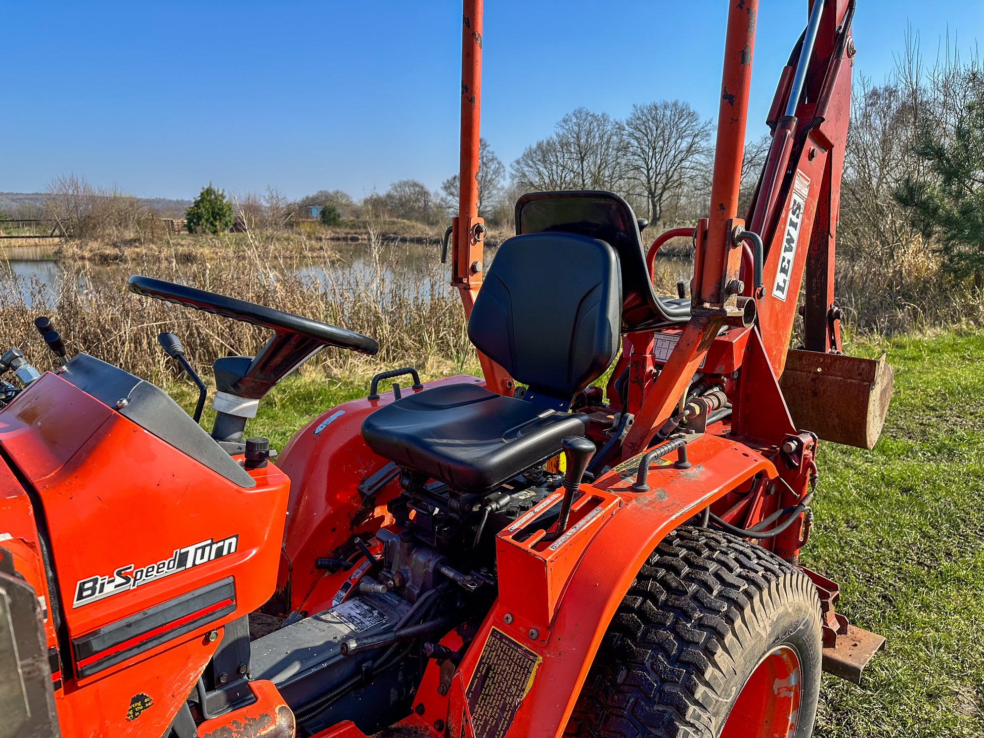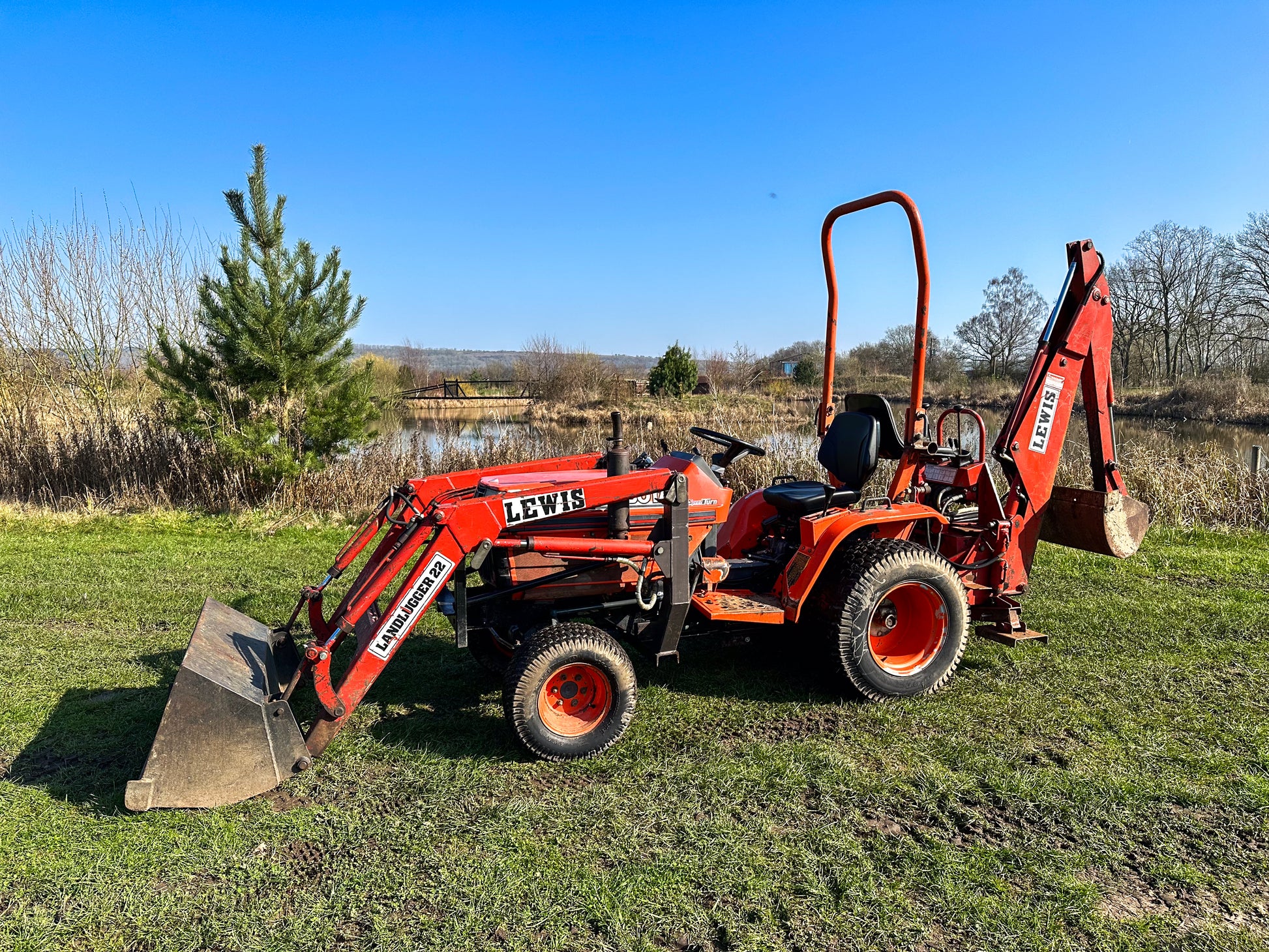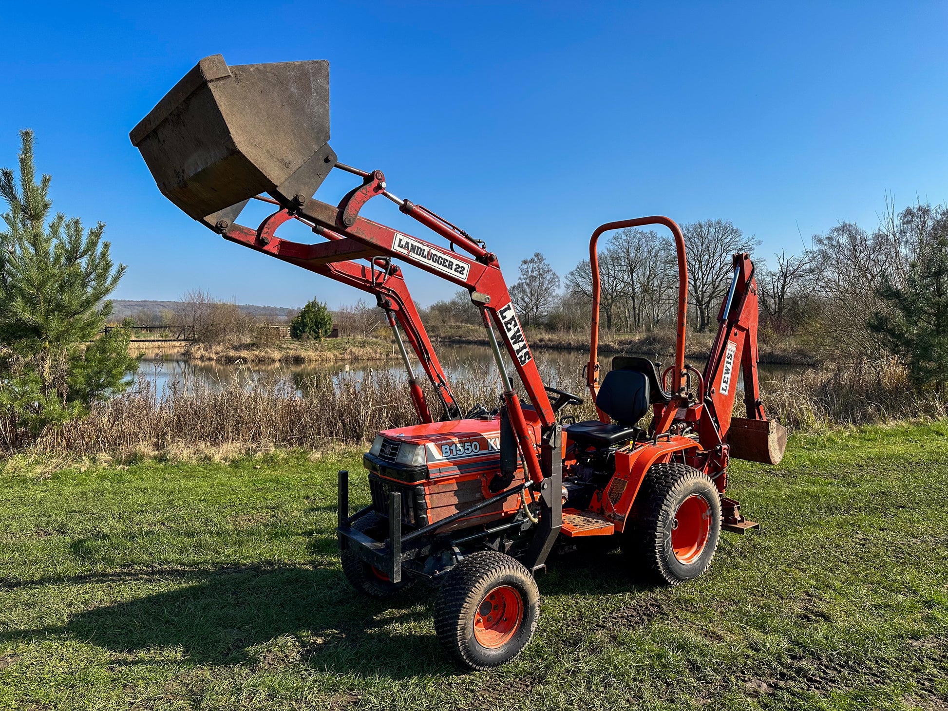 This 20HP Kubota tractor is in very good working condition. It includes a Lewis front loader and Lewis LandLugger backhoe loader. This second-hand tractor offers a substantial saving on buying a new compact tractor.